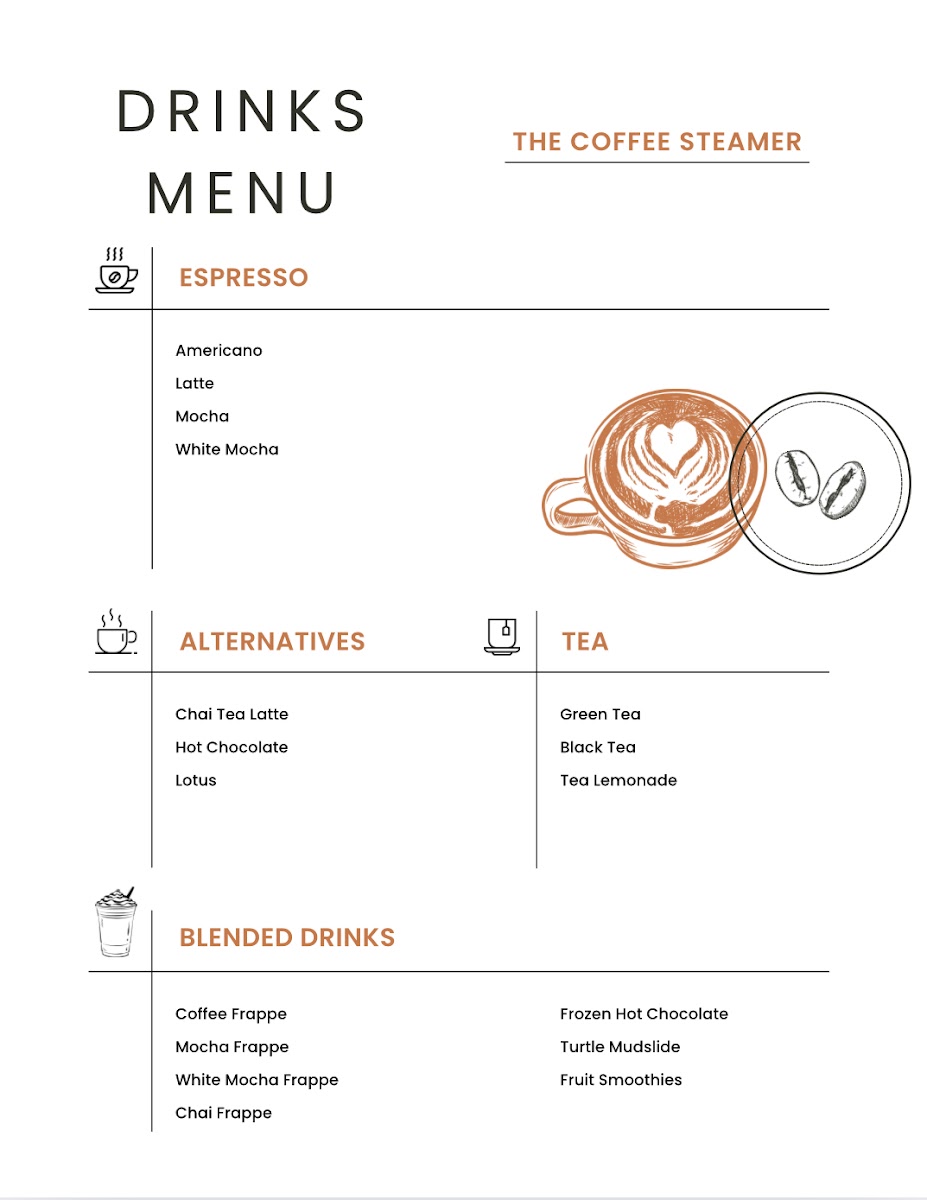 The Coffee Steamer offers a thoughtfully simple café menu that focuses on comforting drinks and casual bites. Here, you’ll find classic espresso-based beverages like lattes and cappuccinos, alongside specialty options flavored with selections such as caramel, vanilla, and toasted marshmallow. For a cozy treat, the coffee cake and scones provide a pleasant companion to your warm drink, while bubble tea and cold lemonade offer refreshing alternatives for lighter moments.